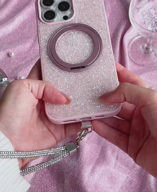 MagSafe phone case covered with iridescent crystals featuring a built-in ring holder and phone stand. Style without sacrificing protection!