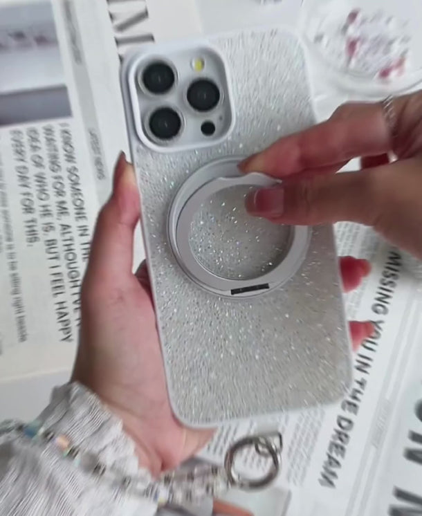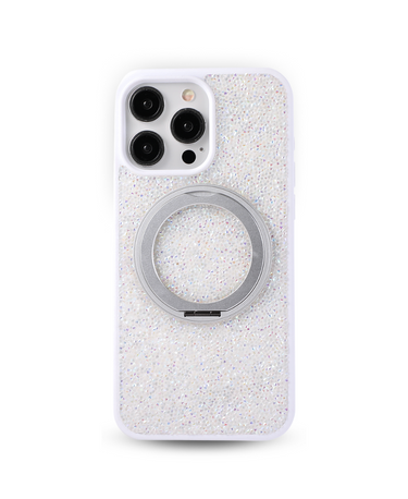 MagSafe phone case covered with iridescent crystals featuring a built-in ring holder and phone stand. Style without sacrificing protection!